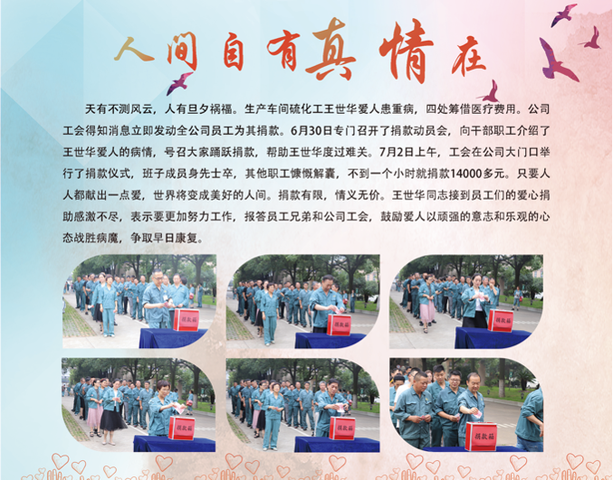 有不測風(fēng)云,人有旦夕禍福。生產(chǎn)車間硫化工王世華愛人患重病,四處籌借醫(yī)療費(fèi)用。公司工會得知消息立即發(fā)動全公司員工為其捐款。6月30日專門召開了捐款動員會,向干部職工介紹了王世華愛人的病情,號召大家踴躍捐款,幫助王世華度過難關(guān)。7月2日上午,工會在公司大門口舉行了捐款儀式,班子成員身先士萃,其他職工慷慨解囊,不到一個小時捐款14000多元。只要人人都獻(xiàn)出一點(diǎn)愛,世界將變成美好的人間。捐款有限,情義無價。王世華同志接到員工們的愛心捐助感激不盡,表示要更加努力工作,報答員工兄弟和公司工會,鼓勵愛人以頑強(qiáng)的意志和樂觀的心態(tài)戰(zhàn)勝病魔,爭取早日康復(fù)。