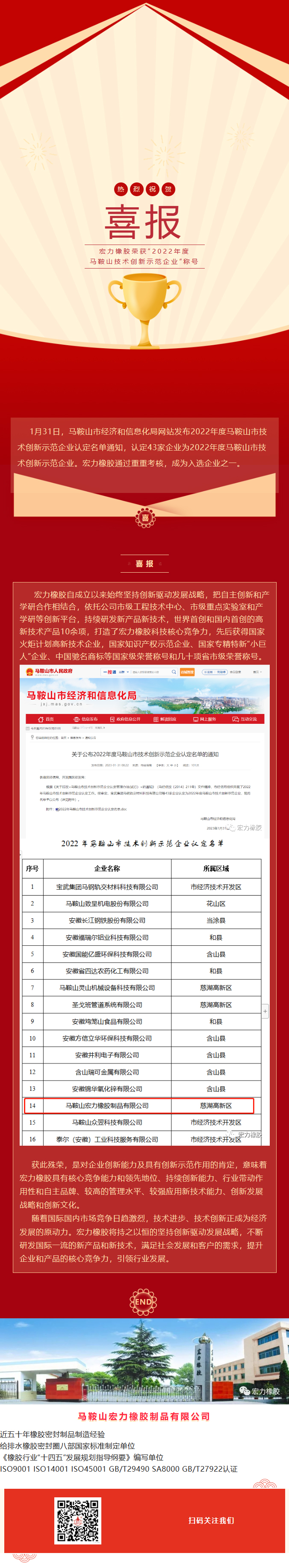 喜訊!宏力橡膠榮獲“2022年度馬鞍山技術(shù)創(chuàng)新示范企業(yè)”稱號